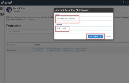 In this example we will add an A record for conference which points to the IP address 46.43.20.11